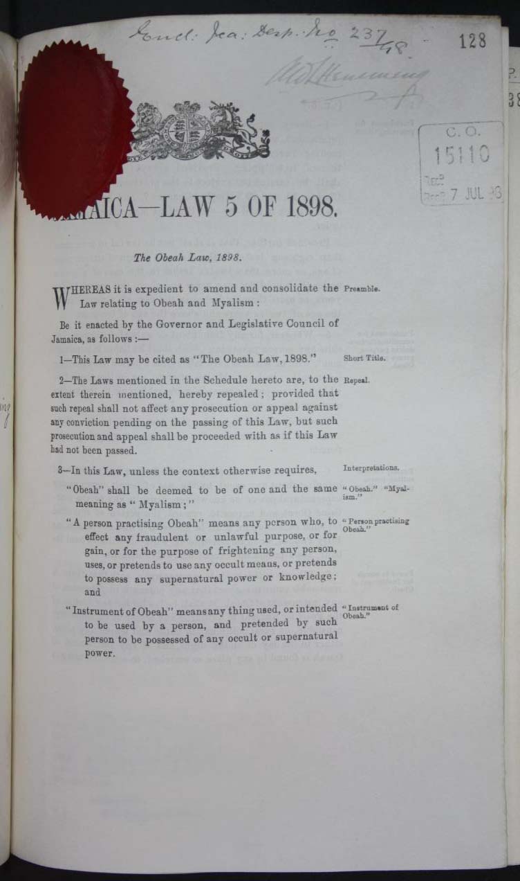 The Obeah Law, 1898, CO 139/108, The National Archives, UK